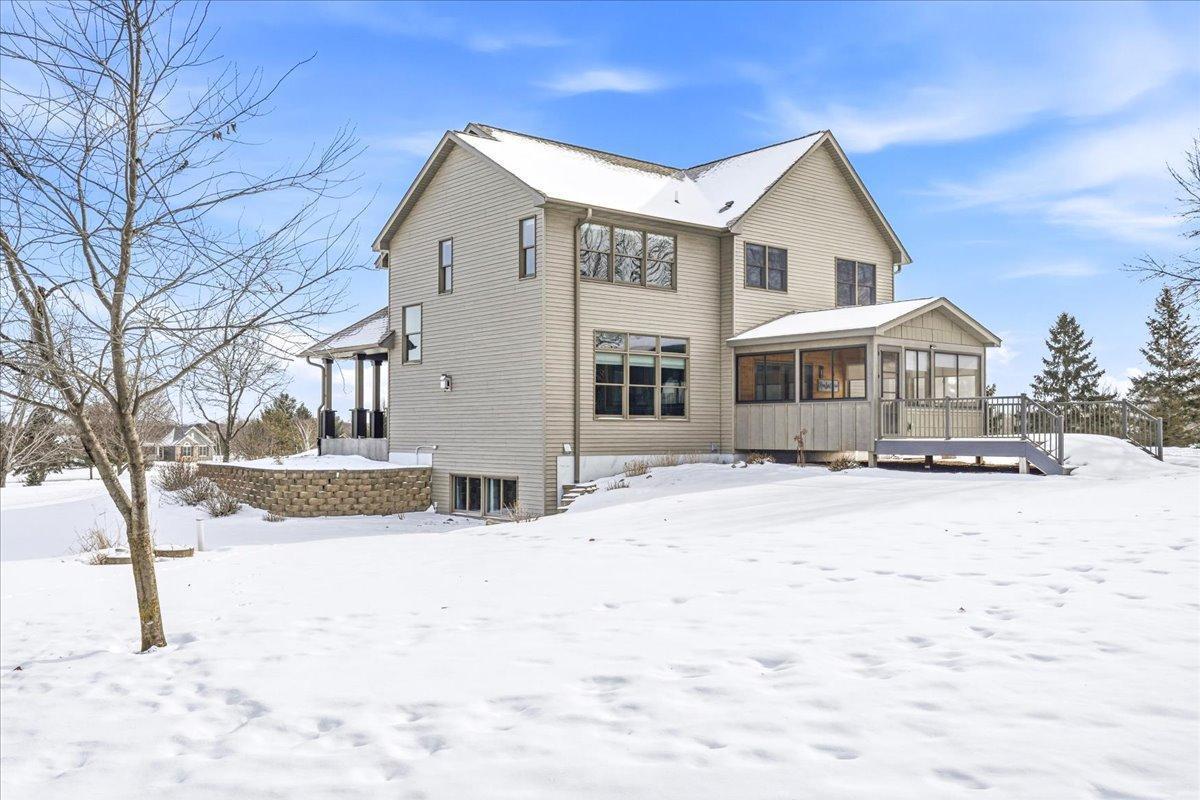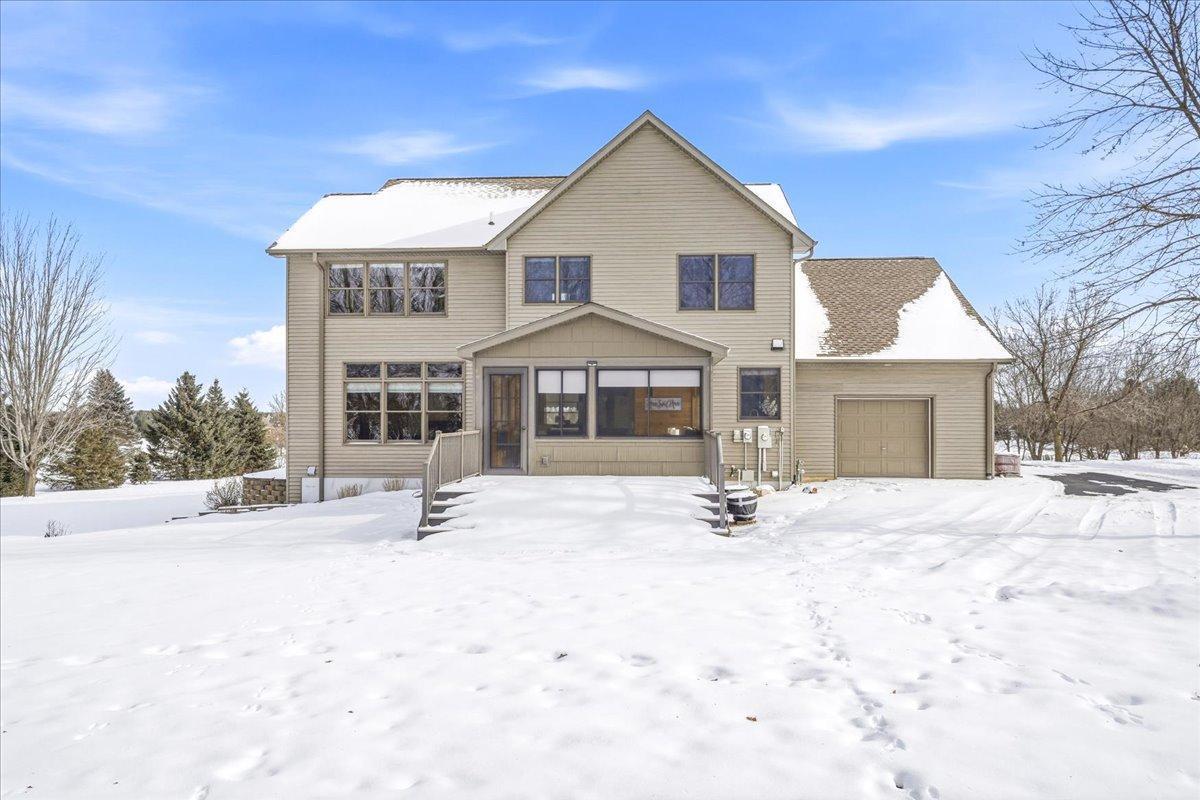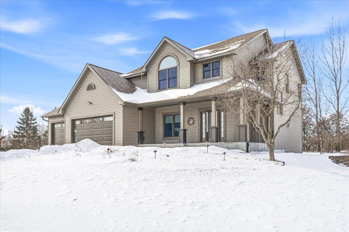 Located in the highly coveted Waters Edge neighborhood of New Richmond, this three-bedroom, three-bath, two-story home offers a perfect blend of comfort, space, and a peaceful country setting. Step inside to a welcoming foyer that opens to a sitting room and a cozy living room with a fireplace, creating an inviting atmosphere for everyday living and entertaining. The large kitchen features a center island and flows seamlessly into the dining area, while a beautiful sunroom provides additional living space with views of the stunning landscaping. A convenient half bath and a mudroom with laundry complete the main level. The upper level includes a full bath and three bedrooms, highlighted by a spacious primary suite with a private bathroom featuring a soaking tub and separate shower. The home also offers an impressive four-stall attached garage, with three stalls in the front and an additional stall in the rear—ideal for lawn equipment, toys, or extra storage. Set in a serene, country-like environment, this property is surrounded by beautiful landscaping and frequent wildlife, offering a peaceful retreat while still being close to town. This home is exceptionally clean, meticulously maintained, and truly gorgeous both inside and out—showcasing pride of ownership at every turn.